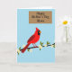 This design shows a bright red songbird perched on a brown branch, set against a wide sky-blue background that feels like an early spring morning 🌼. The bird has a dark face marking and a warm orange beak, and its alert posture suggests it’s pausing as if listening to someone close by. Small white blossoms with soft yellow centers dot the branch, and a few fresh green leaves curl outward like gentle waves beside the bird ❤️. The open space of the blue sky gives the scene a calm, airy look, letting the red feathers stand out with a tender, friendly warmth. In the upper right area, a muted brown rectangular banner floats neatly, adding a cozy, grounded touch to the airy setting. A short message is placed inside that banner in a casual handwritten style, using a dark ink color that contrasts clearly against the brown. The branch runs horizontally across the lower portion, with the blossoms spaced lightly along it and the banner hovering above near the top right corner.