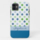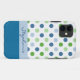 Protect your iPhone 5 in this pretty case. With a real girly girl look, this case is done in white, with a green and blue polka dot pattern, on top, and a solid blue on the bottom of the case. A light blue stripe runs across the middle, with custom blue script text. Personalize this pretty case for yourself or as a great gift idea.