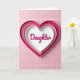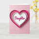 This card shows layered heart shapes nested inside each other, drawing your eye inward like a quiet hug ❤️. The outer heart is a deep fuchsia shade, fading into soft pink and then a bright white center that feels gentle and close. In the middle, the word “Daughter” sits centered in fuchsia lettering with smooth, flowing strokes, giving it an affectionate, close-to-home look. The raised layers create a subtle 3D effect, and the soft lighting adds tiny shadows that make the hearts feel touchable and tender. The overall scene suggests a loving bond through its calm color transitions and the way the center heart seems protected by the layers around it. Behind the hearts is a neat pattern of pale pink rectangular tiles that keeps the focus on the message while adding a cozy, home-like setting 🌼. Fine white lines between the tiles form a light grid across the background.