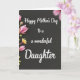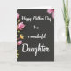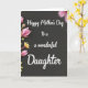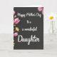 This greeting card features a deep charcoal gray background that feels like a quiet evening, setting a tender tone for a family bond ❤️. Centered along the main vertical line, flowing white lettering reads, “Happy Mother’s Day to a wonderful Daughter,” with a faint shadow that gives the words a gentle lift from the surface. The message sits prominently in the middle, leaving comfortable breathing room around it so the eye lingers on each line. Along the left edge, soft pink buds and partially opened blossoms lean inward as if sharing a close, affectionate moment with the text. A single yellow flower with a dark red center adds a warm contrast, tucked among slender green stems and small leaves 🌼. The overall layout feels balanced, with the florals framing the message without crowding it, like a quiet embrace. In the upper right corner, a blurred sweep of a larger pink petal fades softly into the dark background.