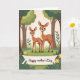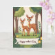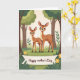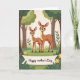 This card shows two stylized deer-like animals in a quiet woodland, standing close in the center foreground with a gentle, affectionate closeness ❤️. The larger one stands slightly behind and beside the smaller one, as if guiding it forward, and their wide dark eyes and soft lashes give them a tender, trusting look. Their coats are warm fawn-brown with tidy rows of white spots, and the pair is framed by leafy greens and tall tree trunks that fade into the background. The lighting feels soft and even, like a calm daytime stroll, with rounded shapes and simple outlines keeping the scene easy on the eyes. Along the lower part of the design, a ribbon-like banner stretches across with a short message printed in a dark tone that contrasts clearly against the lighter banner color. Small yellow flowers sit near the banner on both sides, adding sunny touches 🌼. Behind them, layered green foliage and muted brown trunks create a cozy forest backdrop with plenty of open space around the pair.