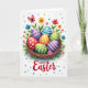 Designed with a detailed woven basket at the center, this card shows seven glossy egg-shaped decorations nestled together like close friends sharing a secret. Each one shines in a different color—red, violet, orange, green, and blue—finished with white dots or neat stripes that make the group feel coordinated. Around the basket, leafy stems and spring flowers in yellow, red, blue, and pink lean inward, as if they’re gathering for a gentle group hug 🌷. A small red winged insect with thin antennae drifts above, adding a light sense of motion across the scene. The background stays bright white, sprinkled with tiny colored circles that read like confetti. Along the bottom edge, a flowing red message is centered and easy to spot, standing out clearly against the white space 🐰. The basket is framed by fresh green leaves and clustered blossoms, with scattered round accents floating in reds, blues, greens, and yellows.