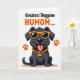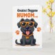 This card features a dark-furred, humanlike dog standing front-facing on a white background, grinning with a pink tongue out as if leaning into a friendly, affectionate moment ❤️. Relaxed floppy ears frame its face, and the confident posture gives it a fun, buddy-like charm. Bright orange sunglasses sit across its eyes, adding a flirty, upbeat attitude without needing a detailed setting. Around the dog, three orange paw prints hover like little hints of companionship and shared laughs. Across the top, the text “Greatest Doggone” appears in a dark font, with “HUMOM...” placed right after it in matching orange for emphasis 🌼. The limited palette keeps attention on the character and the warm, playful contrast between the dark fur and orange accents. A thick golden chain necklace hangs at the neck with a bone-shaped pendant that catches the eye. The final look shows crisp outlines, orange accessories, and three floating orange paw prints spaced around the dog.
