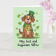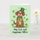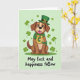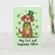 This card features a cheerful brown dog centered on a pale mint-green background, smiling with an open mouth and a pink tongue that makes it feel like it’s greeting a close friend 💚. Warm brown fur is shaded with lighter fawn tones on the muzzle and belly, giving the character a soft, approachable look. A bright emerald leprechaun hat sits slightly tilted on its head, finished with a dark band and a gold buckle that catches the eye. Around its neck, a coiled green scarf with small yellow polka dots hangs neatly, and a gold horseshoe charm dangles like a friendly little gift. Small green shamrocks float around the dog like confetti, adding a festive touch ☘️. Along the bottom, a deeper green strip grounds the scene, and the phrase “May luck and happiness follow” appears across it in flowing white lettering. The overall palette stays in mint and green with gold accents, with the shamrocks scattered mainly around the sides and above the dog’s hat.