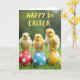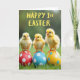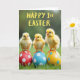 This card shows three fluffy baby birds in sunlit yellow, perched close together as if sharing a friendly, tender moment 🐇. Their tiny orange feet curl around the tops of three decorated eggs, and their dark, curious eyes and small beaks face slightly toward one another like a quiet conversation. The eggs beneath them add bright contrast: one is deep red with white polka dots, one is sky blue with white spots, and one is lemon yellow with blue circles. The scene sits on a thick patch of green grass that softens into a blurred green background, keeping the little birds as the main focus. Across the upper area, the message “HAPPY 1st EASTER” appears in large, hand-drawn-style yellow letters, centered and easy to read 🌷. Gentle lighting highlights the downy texture of the chicks and the smooth, matte look of the eggs. The red egg is on the left, the blue egg is in the middle, and the yellow egg is on the right.