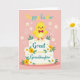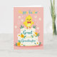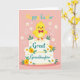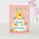 This card features a cute, plump baby chick in sunny yellow with rosy cheeks and a small orange beak, standing proudly as if posing for a loved one 🐰. It balances on a two-tier cake, and the chick wears a red polka-dot bow tie that adds a sweet, dressed-up touch. Across the front of the cake, the words “Great Granddaughter” appear in teal lettering, centered and easy to spot. Around the message, white and warm orange flowers with fresh green leaves curl along the tiers, creating a springtime scene that feels like a gentle hug between family members. Near the top of the design, “Happy Easter” is placed above the chick in yellow and teal text, giving the greeting a bright lift 🌷. The background is a soft pastel pink, keeping the focus on the character and the cake while adding a tender, affectionate glow. Small white outline details—tiny stars and curling swirls—are scattered around the chick and cake against the pink backdrop.