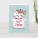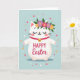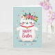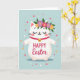 Designed with a chubby, white cat-like character centered on the front, this card leans into spring charm with a gentle, friendly mood 🌷. The character’s rounded shape and relaxed pose feel like a quiet cuddle, with closed eyes, rosy cheeks, and a small smile that suggests cozy affection. A flower crown sits on its head, mixing purple, pink, and yellow blooms with leafy greens, like a sweet gift tucked into the scene. Around its neck is a bright pink collar with a small golden bell that catches the light and adds a soft, flirty sparkle. Across the character’s chest, the text reads “HAPPY Easter,” with “HAPPY” smaller above “Easter,” both in fuchsia lettering that stands out clearly. The background is a pale pastel blue, keeping the focus on the character while still feeling airy and light 🐰. Scattered across that blue are dots in pink, orange, and white, in different sizes like confetti drifting around the figure.