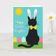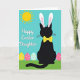 This card shows a glossy black silhouette of a sitting cat-like figure dressed up with tall white bunny ears 🐰, the ear interiors tinted soft pink, and a sunny yellow bow tie with tiny red touches. Under a calm turquoise sky, a golden sun with stylized rays shines from the upper left, giving the scene a bright daytime look. A strip of green grass stretches across the bottom, grounding the character as if it’s posing for someone special. Behind the figure, several decorated eggs peek out in pastel yellow, pink, and light blue, dotted with small polka dots that add a sweet, friendly energy 🌷. On the left side, the greeting “Happy Easter Daughter” appears in white cursive-style lettering, standing out clearly against the blue background. The character’s upright ears and neat bow tie feel like a gentle, affectionate gesture, like it dressed up just to make the recipient smile. The shapes stay simple with crisp edges and high contrast, keeping the focus on the central figure and the holiday details. The sun’s rays fan outward above the grass while the pastel eggs sit partly hidden behind the dark silhouette.