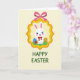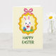 Designed with a sweet seasonal scene, this illustration centers on an upright white bunny with bright blue eyes, rosy cheeks, and pink inner ears, wearing a small red bow at its neck 🐰. The bunny sits inside a golden scalloped frame that feels like a little keepsake, and it hangs from the top by a pink ribbon tied into a neat bow. A pale yellow background keeps the mood light, while the bunny’s gentle expression and soft features suggest a friendly, caring presence. At the bottom, the words “HAPPY EASTER” appear in green, set below the framed scene and easy to spot. On the grass beneath the bunny, a blue egg with white dots and a striped egg in yellow and red sit close by, adding a cozy, togetherness feel 🌷. A red strawberry rests near the eggs, bringing in a natural pop of color. The golden frame, pink ribbon, green patch of grass, and colorful eggs are arranged in a balanced layout against the pale yellow backdrop.
