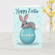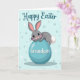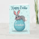 This card features a plump grey bunny perched atop a large teal-blue egg, its tiny paws resting gently as it leans in with a tender, friendly look 🐰. The bunny’s big dark eyes face forward, with blush-pink cheeks, a small nose, and long ears with rosy inner details that soften the scene. A fluffy white tail peeks out behind, adding a cozy, affectionate touch to the pose. Near the top, the words “Happy Easter” appear in dark teal lettering, centered above the characters. Across the middle of the egg, “Grandson” is written in rounded white letters with a faint shadow for contrast. The background is a light sky-blue field sprinkled with small polka dots in white and pale blue, giving the space a gentle, airy feel 🌷. Cool blues dominate the palette, warmed by pink accents on the bunny’s face and ears. The egg has a smooth, glossy look with subtle shading along its curved edges.