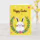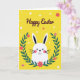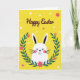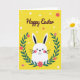 This greeting card features a white rabbit character peeking up from the bottom edge, with big black eyes, a small dark nose, a curved smile, and rosy cheeks that give it a sweet, friendly look 🐰. Its tall ears stand straight with darker inner sections, adding a perky silhouette against the background. A half-circle wreath of deep green leaves wraps around the rabbit like an affectionate hug, dotted with small blossoms in red and pink that feel like little gifts tucked into the greenery 🌷. The backdrop is a sunny yellow field sprinkled with tiny white dots and a few small flowers, creating a light springtime setting. Near the top, the words “Happy Easter” are placed prominently in flowing dark maroon lettering. The text sits above the rabbit’s ears, leaving open space so the character and wreath remain the focus. The overall layout keeps the rabbit centered, framed by the curved foliage, with the yellow background and scattered dots filling every corner. Small red and fuchsia flowers nestle between the dark green leaves along the wreath’s arc.