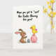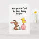This card features a stark white background with a friendly spring scene and a gentle, affectionate energy 🐰. Near the top, a large, informal greeting is placed in dark lettering, centered and easy to read. Below the text, a brown, long-eared bunny-like character with rosy cheeks and bright blue eyes faces slightly toward a small companion, paws lifted as if offering a warm hello 🐇. To the side, a tiny yellow chick stands atop a large pink egg decorated with white and darker pink dots, its head tilted toward the long-eared figure in a sweet, buddy-like glance. A small pink heart sits on the chick’s wing, adding a soft hint of romance without saying a word. Between them rests a smaller plain gray egg, keeping the scene balanced and grounded. The colors stay rich and smooth against the white space, with soft lighting that gives the characters a gentle shine. The pink egg sits low in the layout with the chick perched on top, while the plain gray egg is positioned closer to the center between both figures.