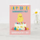 This design shows a fluffy yellow hatchling with a tiny orange beak and shiny black eyes, standing proudly on a smooth white cake while giving the scene a sweet, friendly closeness 🐰. The cake is decorated with small yellow flower shapes that suggest early spring, like a gentle nod between loved ones. Around the cake and spilling near its base are colorful eggs in teal, red, and yellow, each dotted or patterned to add extra texture. The background is a soft pastel pink that keeps everything warm and tender without distracting from the main figures. Near the top, the words “HAPPY EASTER” sit centered in alternating yellow and teal letters, easy to read against the pink. Beneath that, and again along the bottom edge, “GRANDDAUGHTER’S FIRST” appears in crisp white text, spaced to frame the illustration and guide the eye downward 🌷. A small white daisy with a bright yellow center rests near the lower right corner.
