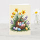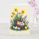 Designed with a rustic woven basket as the main focus, this card shows it nestled in a thick patch of green leaves, like a little scene set up for sharing. The basket is colored in warm browns and filled with pastel eggs in soft blue, pink, purple, and yellow, some dotted or striped for extra charm 🐰. A few eggs sit near the base, spaced close together like they were gently placed side by side by someone who cares. Behind the basket, tall golden trumpet-shaped flowers rise on slim green stems, their centers shaded a deeper orange, adding a sunny backdrop 🌷. Slender spikes of small lavender flowers weave in among the greens, creating a calm contrast that feels like a quiet, friendly moment in a garden. The greeting text sits near the top in a light, springlike color, with smaller wording placed below in a matching tone so it doesn’t crowd the artwork. Everything is set against a creamy background, and the basket’s woven texture and the eggs’ smooth shine are highlighted by a soft glow.