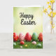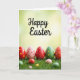 This card features a spring scene with a neat row of brightly colored decorated eggs nestled in fresh green grass along the lower third, with a cozy, together-feel like friends gathered side by side 🐰. The eggs show varied patterns, including yellow polka dots on red and deep green, plus white swirls and textured details that add a gentle, affectionate touch through their careful arrangement. An orange egg includes small heart-like accents, and a pale pink egg with darker red dots softens the mix with a sweeter note 🐇. The foreground grass and a few tiny candy-like bits are softly blurred, guiding your eye back to the crisp egg details. Near the top, the words “Happy Easter” appear in a flowing handwritten style, set in a dark tone that stands out clearly. Behind the lettering, the background fades into a sunlit haze of pale green leaves, keeping everything airy and light. The eggs sit evenly spaced, with the tallest blades of grass leaning slightly forward around them.