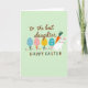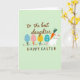 This design shows a pale green background that sets a calm spring scene, with a friendly holiday message placed near the center in flowing lettering paired with a thicker, easy-to-read style. Four egg-shaped decorations rise like garden blooms on slim stems with small green leaves, and their polka dots alternate in soft blue, gentle pink, sunny yellow, and teal. The arrangement feels balanced and close-knit, like a group of friends gathered side by side. Nearby, a small white bunny with long ears shaded pink sits close to an orange carrot, angled as if sharing a quiet moment 🐰. The message text appears in a darker green tone, with a few words highlighted in a warmer accent color to draw the eye. The overall palette stays light and springlike, with rounded shapes and soft edges that suggest tenderness without needing extra flourishes 🌷. In the lower area, the stems and leaves form a loose cluster beneath the dotted eggs, while the bunny and carrot rest just to the right.