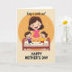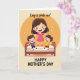 This card shows a sunny digital illustration of a mother and two young boys sharing a light, affectionate moment ❤️. A woman with flowing dark hair wears a bright pink dress and floats slightly above a cozy bed, her feet lifted as if she’s mid-laugh. She stretches her arms outward to hold each boy’s hand, and their matching grins and eager stances make the connection feel tender and close. One boy wears purple and the other wears yellow, and they stand atop a soft bed with a deep red frame, adding a snug, homey setting. Behind them, a warm ochre arc and tiny sparkles create a gentle glow, like a little burst of family warmth 🌼. The background stays soft and sun-kissed, keeping attention on their faces and the way their hands link together. There is no visible text on the front, and the scene is framed by the warm backdrop, the red bed edge, and scattered sparkles around the figures.