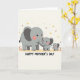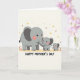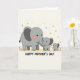 This design shows a sweet family of three gentle, elephant-like animals lined up from left to right, with the largest adult in soft gray leading the scene. Two smaller youngsters stand close by, their rounded shapes and bright black eyes giving them a friendly, affectionate look ❤️. Each one has a blush of rosy cheeks, and the adult’s darker ear details add a little contrast without feeling heavy. The adult’s trunk curves toward the tiniest one, creating a caring, close connection that reads like a quiet cuddle in picture form. Beneath their feet is a light sandy strip of ground, while the wide cream background feels airy and calm. Scattered across the upper area are small golden stars, tiny red starbursts, and soft orange dots, like gentle confetti floating above 🌼. A short message sits along the bottom in darker lettering, standing out clearly against the pale background, with the decorations sprinkled mostly above the family.