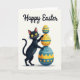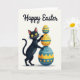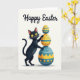 This greeting card features a dark charcoal cat standing upright on a soft cream background, with golden eyes and a small pink nose that give it a tender, friendly look. One paw lightly steadies a tall stack of three decorated eggs, as if the cat is carefully showing them off to someone close by 🐰. The eggs are colored in sunshine yellow and deep teal, with patterns like polka dots, horizontal stripes, zigzag chevrons, and tiny snowflake-like details on the largest one. Gentle shading under the cat and the egg stack adds depth, while the simple shapes keep the scene easy to take in. Near the top, a celebratory message appears in flowing black lettering, centered above the illustration. The layout guides your eye from the text down to the cat’s careful paw and the wobbly stack, creating a sweet, shared moment 🌷. The largest egg at the bottom shows teal snowflake-like markings against a warm yellow base.