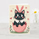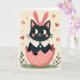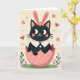 This card features a dark-furred cat with big, shining eyes peeking out as if sharing a shy hello, wearing long soft-pink bunny ears 🐰 and a small ring of coral blossoms on its head. A crisp white collar with pink polka dots frames its face, adding a sweet, friendly touch that feels like a gentle hug. The cat rises from a cracked rose-pink eggshell sprinkled with white spots, with the shell pieces curving outward like they’ve just opened for a spring surprise. Near the top, a short Easter greeting sits centered in small, light pink lettering against the pale background. Behind the character, the backdrop is a creamy pastel field with a faint grid texture and tiny starburst sparkles, giving the scene a soft glow. Warm pink and red flower shapes drift around the cat like little notes of affection, while a green patch of ground below holds thin stems and budding blossoms 🌷. The illustration has a slightly grainy finish, and the egg rests above a cluster of tiny pink flowers and fresh green shoots.