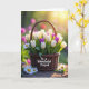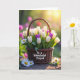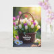 Designed with a rustic garden feel, the front shows a dark brown woven basket brimming with slender tulip-like blooms in white and deep violet, nestled among fresh green leaves. A few small white flowers with sunny yellow centers rest inside the basket and spill onto the textured surface below, as if someone gently set them down for a friend ❤️. Warm light pours in from the upper right, making the petals glow softly and giving the scene the cozy hush of morning or late afternoon. The background fades into blurred greens with soft touches of magenta and gold, keeping your attention on the flowers in the foreground. A short message sits near the top in flowing dark lettering, with a smaller line beneath it in a lighter tone, like a quiet note left for someone special 🌼. The basket’s thick strands curve around the arrangement, and a few loose blossoms lie near the lower edge where the sun dapples the ground.