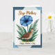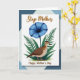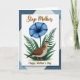 Designed with a calm nature scene in mind, this greeting card features a bright white center panel that lets the artwork stand out while still feeling soft and inviting ❤️. Near the top, a large deep-blue flower opens like a quiet spotlight, with petals shifting from lighter sky tones to darker midnight shades. Below it, a small ground bird stands among leafy greens, its warm brown feathers dotted with tiny speckles that give it a gentle, companionable look. The bird’s subtle crest and steady posture add a touch of character, as if it’s pausing to keep someone close. Around the bird, smooth broad leaves mix with fern-like fronds, creating a cozy little shelter that hints at affection through closeness rather than words 🌼. A flowing line of sepia-colored lettering curves along the frame, with the greeting placed around the outer edge so it encircles the scene. The deep blue bloom sits above the bird, while layered green foliage fills the lower half against the crisp white background.