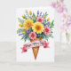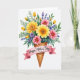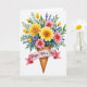 Designed with a joyful floral scene, the card shows a generous bouquet spilling out of a golden-brown waffle cone, turning a sweet treat into a tender gift ❤️. Large daisy-like blooms in sunny yellow and bright pink fill the center, and their detailed flower hearts draw your eye like a shared glance between close friends. Smaller lavender and periwinkle blossoms tuck in around them, adding gentle contrast and a soft, affectionate mood. Slender green leaves and stems weave through the arrangement, with tiny unopened yellow buds scattered like little promises between the flowers 🌼. A soft pink ribbon wraps around the cone and trails outward in a loose curl, creating a space for the message. The text sits on the ribbon in a flowing, dark ink style that stands out clearly against the pale pink. Everything rests on a plain white background that keeps the cone’s crisscross texture and the layered petals easy to notice. The waffle cone shows a neat lattice pattern with warm shading along the edges.