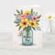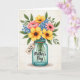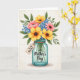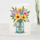 This card shows a lush bouquet arranged in a clear, aqua-tinted glass jar, with a cozy, close-knit feel that suggests someone thoughtfully picked each stem for a loved one ❤️. Large sunlit yellow blooms take center stage, surrounded by coral-pink flowers that lean in softly, like friends gathered for a sweet moment. Small bright blue florets are sprinkled throughout, adding contrast against deep green leaves that fill out the arrangement. The lighting looks gentle and bright, making the petals and foliage feel fresh and inviting without looking harsh. The jar is slightly see-through, and you can see the stems dipping into the water for a realistic touch. A small kraft-paper-style tag is tied around the jar’s neck with twine, and it carries a short message in dark ink near the middle of the tag. Additional lettering appears directly on the jar in a darker tone, placed across the front so it’s easy to notice, with a little 🌼 nearby. Behind everything, the background has a faint grid pattern in a light neutral shade.