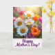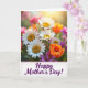 This design shows a sunlit bouquet filling the frame, with soft-focus greenery behind it and a warm glow coming from the upper right. White multi-petaled flowers with bright yellow centers sit front and center, leaning toward one another like close friends sharing a quiet moment ❤️. Around them are orange cup-shaped blooms with gently opening petals, plus small touches of purple and soft pink flowers that add depth and contrast. The lighting feels like an early spring morning, making the petals look fresh and slightly luminous, as if they’re basking together in the same beam. Near the bottom, a crisp white banner stretches across the image, edged with a fine dotted pink border. Centered on the banner is the phrase “Happy Mother’s Day!” in deep purple lettering, standing out clearly against the white space 🌼. The background stays softly blurred while the foreground flowers remain sharp, and the orange blooms frame the banner from both sides.
