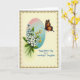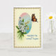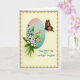 Designed with a soft, romantic touch, the card features a bouquet of white and pale blue flowers with sunny yellow centers, nestled among green leaves and slender stems. Small golden-yellow buds peek through the arrangement, adding texture like little sparks of affection ❤️. The flowers sit inside a tall oval vignette that fades from blush pink at the top to cool aquamarine at the bottom, giving the scene a gentle glow. To the right, a winged insect hovers close, its orange wings patterned with black markings and dotted with tiny white specks, as if drawn in by the bouquet’s quiet charm 🌼. An ornate antique-gold border with curling flourishes frames the creamy background and gives the design a classic finish. A short Mother’s Day message appears in a flowing handwritten-style font, placed near the top of the oval in a soft gray-blue color. A smaller line of text sits beneath the bouquet in warm golden lettering, echoing the border. The insect’s antennae angle toward the nearest bloom, and its wings are spread wide beside the oval frame.