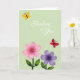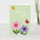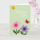 This card features a soft sage green background that sets a calm, gentle scene for a sweet message ❤️. Near the bottom, two stylized flowers sit side by side like close friends leaning toward each other, each with five rounded petals and a warm yellow center. The left flower is pastel pink with smooth shading and faint radiating lines from the center, while the right flower is lavender with similarly soft gradients. Above them, a small yellow butterfly floats in the upper left with a dark body, adding a light, airy touch. On the upper right, a red butterfly hovers as if drifting back toward the center, creating a quiet sense of connection across the space. Centered above the flowers, a short phrase appears in white lettering, placed to stand out clearly against the green. Small highlights on the petals and gentle color transitions give the blooms a softly lit look, with the butterflies angled as if mid-flutter 🌼.