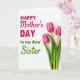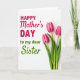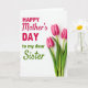 This card features a bright white background with three fuchsia-pink flower buds on tall green stems arranged along the right side, their petals still partly closed like they’re saving a sweet moment for later. Soft lighting gives the blooms a gentle glow and adds light shadows that make the stems feel real and close. On the left, the main line “HAPPY Mother’s DAY” sits near the top in deep red letters, standing out strongly against the white. Just beneath it, “to my dear” appears in olive green, smaller and placed like a quiet aside between close friends. The final word “Sister,” also in olive green, is written in a flowing style that reads like a warm note passed between siblings ❤️. The spacing leaves plenty of open air between the text and flowers, so the message and bouquet seem to lean toward each other 🌼. The three blossoms cluster near the upper-right area, with their stems reaching down toward the lower-right corner.