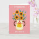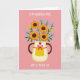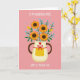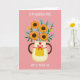 This design shows a creamy, lightly textured pitcher holding a lush bouquet that feels like a gentle thank-you shared between close hearts ❤️. Four sturdy golden-orange flowers with deep earthy centers sit front and center, surrounded by emerald leaves and tiny light-blue berry clusters that soften the scene. The pitcher has warm brown handles that frame the arrangement like an embrace, adding a cozy, affectionate touch. A bright red ribbon is tied into a neat bow on the pitcher, and a small red heart sits above it as a quiet sign of love. Near the base, a yellow panel with small white polka dots brings a sunny, friendly note 🌼. The background is coral-pink with scattered pale blue dots, giving the setting a light, celebratory feel. White text appears at the top and again near the bottom, set in simple lettering that stands out clearly against the pink. The bouquet rises upward from the pitcher opening, with the blue clusters peeking between the orange petals and green leaves.