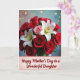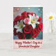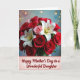 This card shows a lush bouquet filling most of the front, with deep crimson roses layered like soft velvet beside crisp white lilies with bright yellow centers, plus a few blush-pink roses that add a gentle, affectionate touch ❤️. The flowers sit against a softly blurred background where pastel blues and pinks melt together, giving the scene a calm, romantic glow. Small golden light dots are scattered around like distant twinkles, suggesting a special moment shared with someone close. The lighting is diffused and warm, bringing out the petal edges and making the reds and whites stand out without looking harsh. Near the bottom, a narrow banner with a lightly scalloped edge stretches across the width, creating a tidy space for the message. The text reads “Happy Mother’s Day to a Wonderful Daughter,” centered on the banner in a warm-toned lettering style that contrasts clearly with the lighter background 🌼. The bouquet’s deepest reds cluster toward the middle-left while the white lilies rise slightly higher, drawing your eye upward before it settles back on the banner. Behind everything, the pastel wash fades from bluish tones on one side into pink on the other, with the golden dots sprinkled in between.