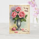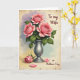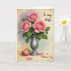 This card shows a floral still life with three fully opened pink blossoms centered in a cool silver vase, their layered petals painted to look soft and gently curled. Deep green leaves surround the blooms, and the way they lean toward one another suggests a quiet closeness, like friends sharing a private moment ❤️. Behind them, a light wash of lavender fades into pale teal and then warm cream, giving the scene an airy, relaxed setting. The background also has an aged paper look with faint speckles and worn edges, adding a cozy, timeworn touch. Near the lower front, one extra pink flower lies beside the vase with two loose petals, as if recently set down with care 🌼. A short message appears in flowing lettering near the upper area, set in a muted gray tone that doesn’t distract from the flowers. The vase catches a small, soft highlight along one side, and the resting petals sit slightly to the right of its base.