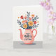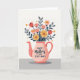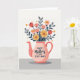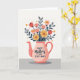 This card features a coral-pink teapot used like a vase, with tiny white polka dots along the spout and a gentle, affectionate feel in the way the flowers lean together as if sharing a quiet moment ❤️. A lightly textured, pale background sits behind it, framed by soft curved lines that keep the scene calm and airy. From the teapot rises a full bouquet of stylized blooms in soft pink, coral, and sunny yellow, arranged so the petals overlap like close friends huddling in for a photo. Deep blue-grey leaves weave between the blossoms, adding contrast and making the warm colors stand out. Small oval shapes in warm orange and light pink float around the bouquet like bits of confetti, sprinkling the space with a celebratory touch 🌼. A short message is printed on the teapot’s front, with flowing cursive-style lettering above simpler, easy-to-read letters in a darker tone. The teapot sits on a muted grey surface, grounded by a soft shadow that falls just beneath it.