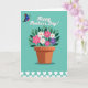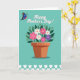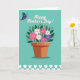 This greeting card features a calm teal background with a terracotta flowerpot centered near the bottom, overflowing with green leaves and stylized blooms in fuchsia, white, and soft lavender. The flowers lean toward each other in a cozy cluster, like close friends sharing space, with a gentle romantic touch in the way the petals overlap ❤️. Near the top, a celebratory message sits above the bouquet in white lettering with a faint shadow for depth. A butterfly hovers in the upper left, its blue wings edged with black and dotted with orange, paired with a bright red body that adds a lively accent. Along the bottom edge, a row of interlocking white heart shapes forms a decorative border, echoing the affectionate mood 🌼. The artwork uses flat shading and simple shapes that keep the scene smooth and easy on the eyes. The butterfly’s wings angle slightly upward as it floats against the teal space.