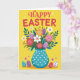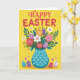 This greeting card features a sunlit yellow background with a turquoise vase covered in small white polka dots, holding a full bouquet that feels like it’s been arranged with a thoughtful, caring touch 🌷. Warm coral text sits prominently near the top, set in a flowing letter style and a thicker letter style, announcing the Easter message in an easy-to-read layout. Inside the vase, stylized flowers in white, orange, pink, and deep red open outward with detailed radial centers, like they’re leaning toward one another in a friendly cluster. Deep green and teal leaves weave between the blooms, adding layered texture and a cozy, gathered-together look. Nestled among the stems are several large purple egg shapes with spots, tucked in as if they’re part of a shared spring surprise 🐰. Below the vase, smaller decorated eggs in blue, purple, red, and white are scattered across the lower area, each dotted with its own pattern. A few tiny floral accents float around the arrangement, softening the space and guiding the eye back toward the center. The bouquet is framed by little floating blossoms and the dotted eggs near the bottom edge.