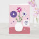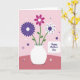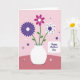 Designed with a bouquet of three stylized flowers arranged in a simple white vase at the center, this card feels gentle and affectionate ❤️. The background is split into two soft pink tones, lighter on top and deeper below, like a quiet tabletop and wall meeting behind the flowers. On the left, a ribbed violet bloom opens wide from a small white center, as if leaning in close to the others. In the middle, a magenta flower with rounded petals is dotted with small white spots, giving it a friendly, upbeat look beside its neighbors 🌼. On the right, a white flower with a dark purple center is sprinkled with tiny dark dots, balancing the bouquet with a calm, caring presence. Thin green stems and a few small leaves rise from the vase, adding a natural touch without crowding the scene. A soft-edged white rectangle sits in the lower right with “Happy Mother’s Day” printed in dark purple, and small white and purple starburst and dot shapes scatter across the pink background.