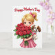This design shows a young cartoon girl with wide, golden-brown eyes and a bright smile, holding a large bouquet of deep red roses close to her chest ❤️. Her light blonde hair is gathered into a high ponytail with a pink bow, and her pastel pink dress has soft ruffles that add a gentle, affectionate look. Behind her shoulder, a friendly spotted dog leans in as if joining the moment, its face turned toward her with an easy, loyal grin. The dog wears a white bow tie marked with a small red heart, a tiny detail that makes their closeness feel like a shared secret. The background is plain white with a soft glow, keeping all attention on the pair and the rich reds and greens of the flowers. Near the top, a short message is placed in flowing red lettering, centered above the characters, like a note floating over the scene 🌼. The bouquet is drawn with layered petals and dark green leaves, and the stems are gathered neatly in her small hands. The pink bow, red text, and heart on the bow tie stand out crisply against the white space.