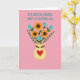 This greeting card shows a cheerful bouquet centered on a soft pink background, with three large golden-yellow flowers and dark brown centers that feel like little suns leaning close together. Several smaller sky-blue blossoms with tiny yellow hearts nestle between the bigger blooms, adding a friendly, affectionate touch ❤️. Slender dark green stems rise with simple leaves, gathered neatly into a rounded creamy yellow vase. The vase is dotted with small white circles, and a shiny red heart sits on its front as a clear sign of closeness and care. Along the top rim, small brown accents add a bit of texture without looking fussy. Above the flowers, the message “Special Cousin” appears near the top in turquoise lettering, standing out clearly against the pink. The layout feels balanced and cozy, like a warm note shared between family members 🌼. The bouquet sits squarely in the middle, with the turquoise text floating above and the red heart centered on the vase.