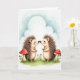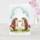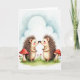 Designed with two small, spiky-backed woodland creatures at the center, this watercolor-style scene shows them standing close on a bright green patch as their noses meet in a heart-shaped touch ❤️. Their rounded, pale underbellies contrast with brownish-gray quills, and their rosy cheeks and soft smiles suggest a sweet bond like close friends sharing a quiet moment. On either side, red-capped mushrooms with white dots rise from the grass, framing the pair like gentle guardians. Scattered around their feet are tiny wildflowers in pink and blue that add a soft, romantic garden feel 🌼. The background opens into a wide, hazy sky washed in light blue, giving the whole setting a calm, airy look. The main greeting sits near the top in a warm pink tone, while a smaller line of text appears below in a darker gray for balance. Fine brush textures show in the grass, the mushroom caps, and the subtle shading along the creatures’ quills.