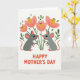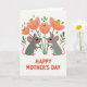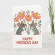 This card shows two soft grey, rodent-like characters facing each other in a balanced pose, their rounded cheeks tinted pink and their dark eyes fixed on one another with a tender, almost-kissing closeness ❤️. Their small noses, tipped in red, nearly touch, and the matching red accents on their tails add a gentle romantic spark without needing extra fuss. Around them, a simple garden scene grows with oversized pink flowers that feel plush and friendly, each with a sunny yellow center and tiny dark details. Fresh green stems and scattered leaves weave between the blooms, giving the pair a cozy little space to share a quiet moment. The background stays bright white, letting the soft grays, warm pinks, and spring greens stand out clearly 🌼. Along the bottom, a short Mother’s Day greeting sits centered in a thick, easy-to-read sans-serif style, colored in strong red to echo the noses and tails. The letters stretch neatly across the lower edge as a grounded base beneath the characters and flowers. Behind them, a tall pink blossom rises between their heads, with a yellow center and fine dark stamens.