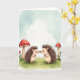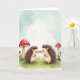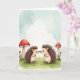 Designed with a soft watercolor look, the front shows two small spiky-backed woodland animals standing close, nose-to-nose, as if sharing a tender moment ❤️. Their rounded cream bellies contrast with warm earthy-brown backs, and faint rosy cheeks make their simple faces look affectionate and friendly. They’re set on a fresh green patch of grass, painted in loose strokes that suggest a spring meadow. On each side, a red-capped mushroom with white spots frames the pair like a gentle storybook scene. A tiny pink flower sits in the left foreground, adding a sweet touch 🌼. There is no wording on the artwork, leaving open space above the animals for your own message if you choose. The sky is washed in pale blue with soft, cloud-like shapes fading into the background.