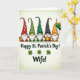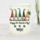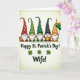 This card shows five cheerful gnomes lined up shoulder to shoulder on a soft cream-to-pale-green gradient background, their tall polka-dot hats in ruby red, emerald green, burnt orange, and one deep black creating a cozy rhythm across the top. Each gnome has a bright white beard and a rosy nose, and their close spacing makes them feel like a friendly little group posing together for a shared moment 💚. Near the lower area, the message “Happy St. Patrick’s Day!” sits in white lettering, with three small four-leaf shamrocks nearby for a lucky touch ☘️. Just beneath that, the word “Wife!” appears as a direct address, adding a tender, close-to-home focus within the layout. On the far left, a golden mug rests beside the first gnome, catching the light against the pale background. In the center, one gnome holds a pot of gold that gleams with soft highlights, drawing your eye to the middle of the row. On the far right, the last gnome clutches green and orange balloons that float upward beside his hat, adding a pop of color against the gentle backdrop.