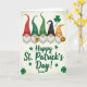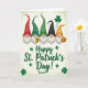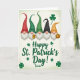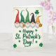 This card shows five friendly gnomes lined up near the top, their fluffy white beards brushing together as if they’re leaning in for a group photo 💚. Each has a small rosy nose and a tall pointed hat in red, several shades of green, and black, dotted with white spots, plus one hat finished with warm orange-gold stripes. Their hat tips curl to the side, giving the row a cozy, companionable rhythm, like close friends sharing a joke. One gnome holds up a shiny golden tankard while another presents a little pot of gold, and the pair sit close enough to feel like a gentle toast between them ☘️. The background is a soft pale green gradient sprinkled with small shamrocks that drift around the figures. Centered below the gnomes, the text “Happy St. Patrick’s Day!” stretches across the middle in deep green lettering. Tiny shamrock accents sit around the message, with the gnomes’ colorful hats forming a bright band along the upper edge.