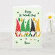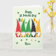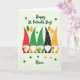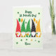 This card shows five gnomes lined up across a pale green background, their tall cone hats in red, two shades of green, black, and orange, each dotted with small white polka dots. Their big white beards cover most of their faces, leaving only rosy noses peeking out, as if they’re shyly leaning close like old friends sharing a joke 💚. Above them, “Happy St. Patrick’s Day!” sits centered near the top in thick, flowing dark green lettering, with small green and golden shamrocks scattered around it ☘️. Two balloons in green and yellow float near the top area, adding a light, party-like touch. On the left, one gnome hugs a shiny golden mug, and the middle gnome in a green hat holds a matching golden pitcher, angled as though offering a friendly pour. The last gnome on the right clasps a single green shamrock close to its beard, like a small token meant for someone special. Near the bottom, the word “Niece” appears in green text, tucked under the row of gnomes against the soft green backdrop.