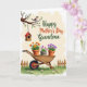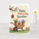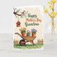 This card shows a calm garden scene where a rustic wooden wheelbarrow rests on rich green grass, like it’s been left there after a caring day of tending flowers ❤️. Inside the wheelbarrow sit three terracotta and gray pots, arranged close together in a cozy little cluster that feels shared and welcoming. One pot is filled with orange and yellow tulips, while the others hold small purple and pink blooms that lean toward each other like close friends. From the upper left, a slim tree branch with fresh green leaves stretches inward, and a small brown-and-white bird perches there as if quietly watching over everything. Nearby hangs a simple wooden birdhouse with a red roof, adding a homey touch that suggests gentle care. In the upper right, the message “Happy Mother’s Day Grandma” appears in flowing lettering, with green and orange text that matches the garden colors 🌼. A short wooden picket fence sits along the lower right edge, set against a warm, creamy background with soft, watercolor-like shading.