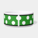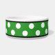 Stylish ceramic dog bowl designed with a big white polka dot pattern over green and personalized with your pet's name.