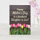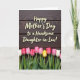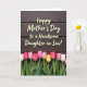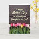 This card features a warm Mother’s Day greeting paired with spring flowers, set against a dark, textured wood background. Near the top, the message “Happy Mother’s Day to a Handsome Daughter-in-Law!” sits in a sunlit yellow, flowing lettering that stands out clearly. The words stretch across the upper area, leaving breathing room around them so the message feels open and welcoming ❤️. Along the lower portion, a horizontal row of tulips forms a soft border, like a gentle bouquet laid down with care. The blooms mix white and several shades of pink, with one bright yellow tulip placed to draw the eye like a sweet, affectionate highlight 🌼. Slender green stems and broad leaves tuck around the flowers, adding a natural frame that feels tender and celebratory. The wood surface shows deep brown tones and visible grain lines running across the card, giving the whole scene a rustic, grounded look.